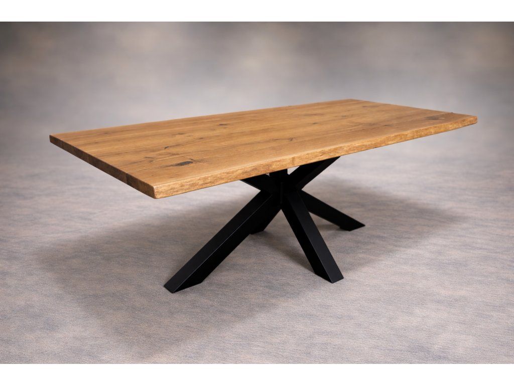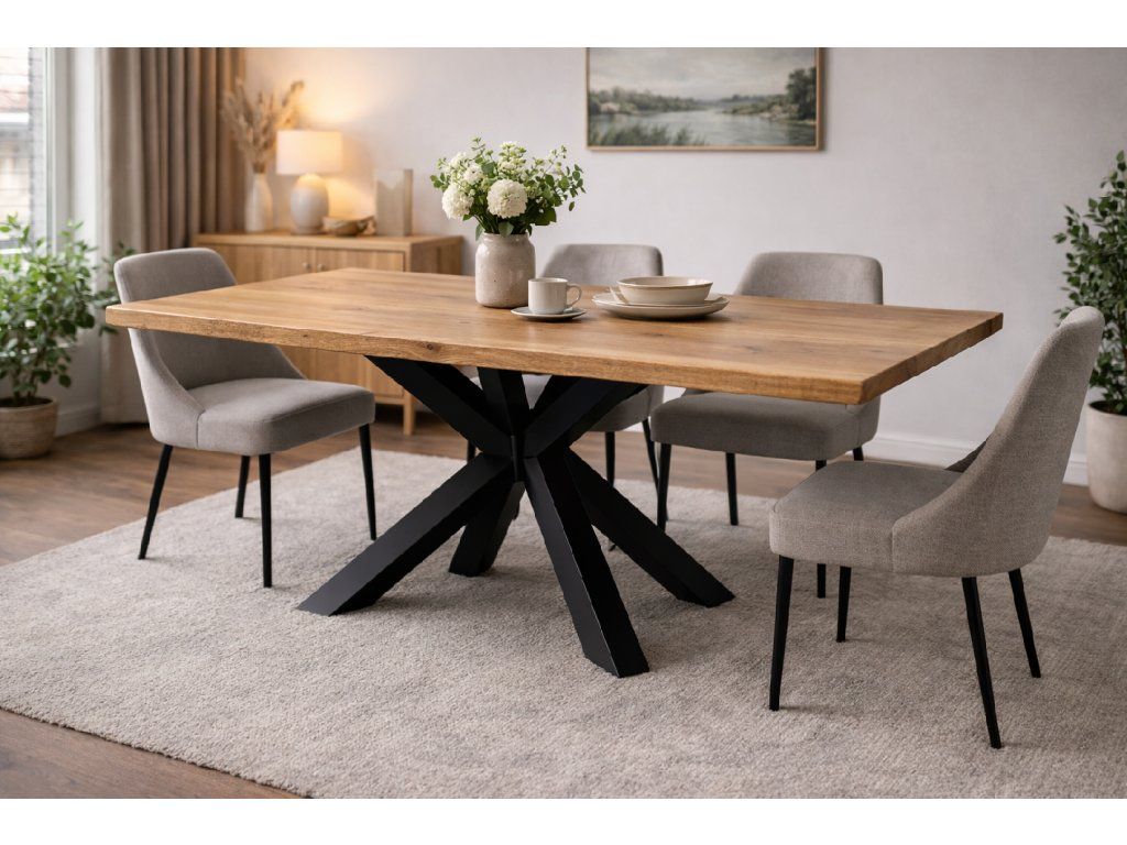 Masivní dubový stůl v kombinaci s kovovou podnoží v moderním a nadčasovém designu.