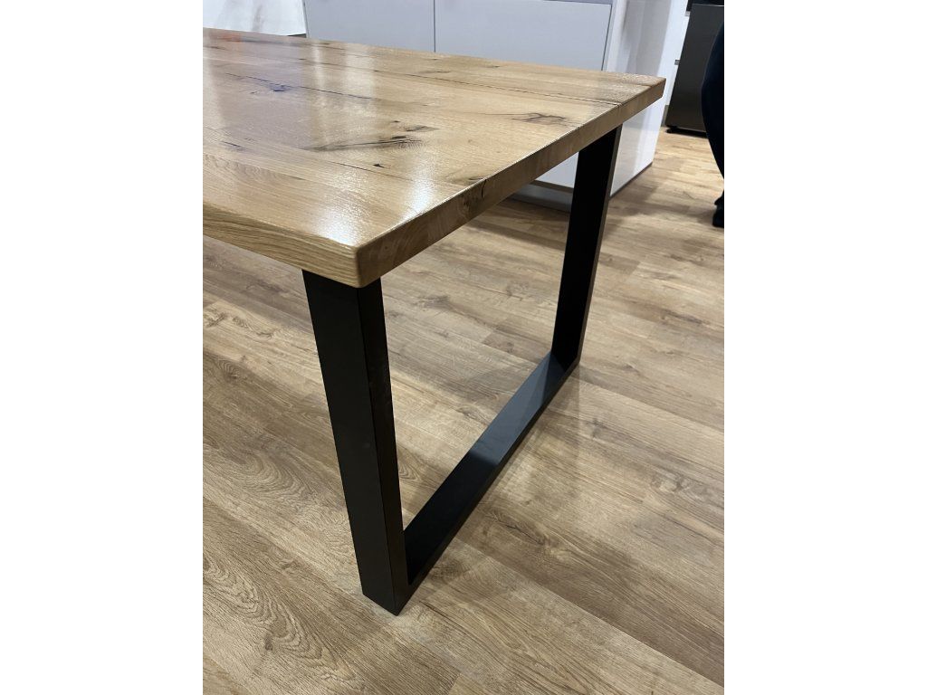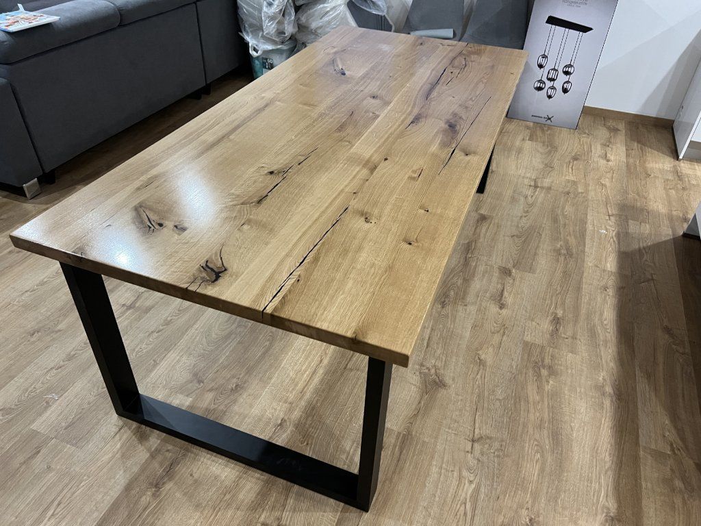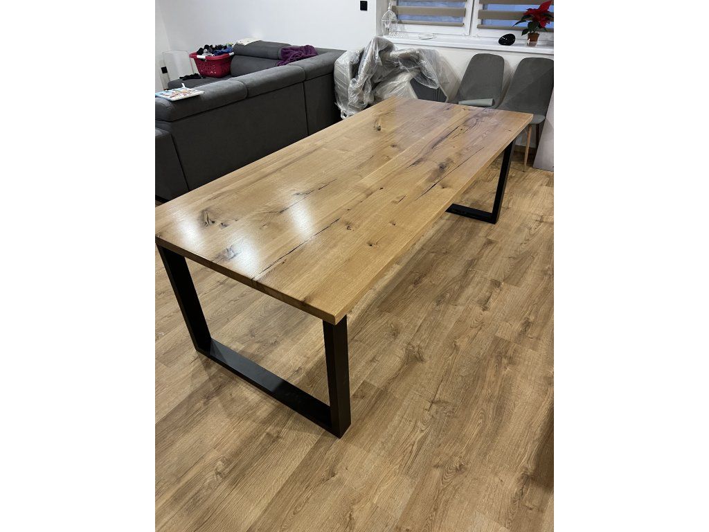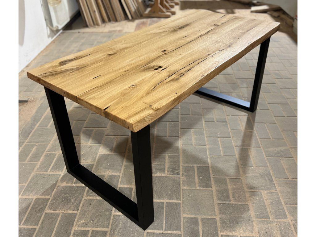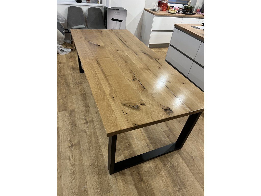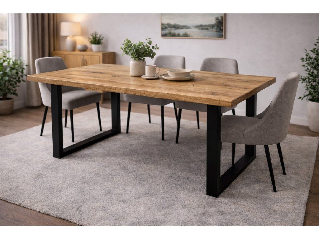 Masivní dubový stůl v kombinaci s kovovou podnoží v moderním a nadčasovém designu. Každý kus je originál s přirozenou kresbou dubového dřeva 🌳