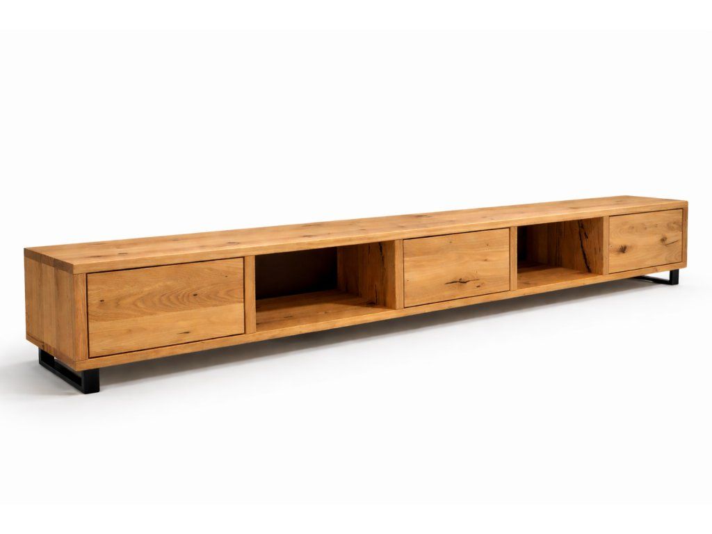 TV skříňka z masivního dubu v kombinaci s ocelovou konstrukcí v moderním a nadčasovém designu.